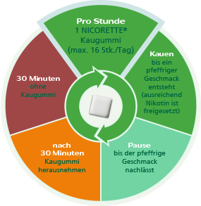 Kauen Sie ca. 1 Minute ganz langsam, bis Sie einen würzigen/pfeffrigen Geschmack spüren. Deponieren Sie das Nikotinkaugummi dann zwischen den Zähnen und der Wange, bis der Geschmack nachlässt. Diese beiden Schritte wiederholen Sie 30 Minuten lang. Kauen Sie dabei nicht zu fest! Dann folgt mindestens eine halbe Stunde ohne Kaugummi.