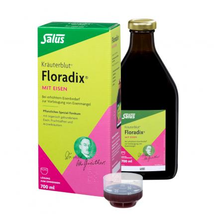 Floradix mit Eisen ist eine Lösung zum Einnehmen bei erhöhtem Eisenbedarf. Sie enthält Eisen(II)-gluconat, das gut aufgenommen wird, und trägt zur normalen Bildung von roten Blutkörperchen, Hämoglobin sowie zum normalen Sauerstofftransport und Energiestoffwechsel bei.